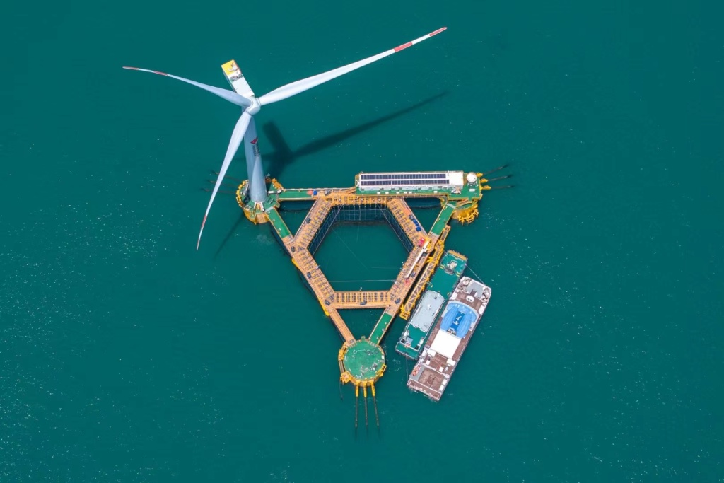 试想一下这样的场景:水下养鱼、水上发电,既生产清洁电力,又孕育“蓝色粮仓”。来到莆田市南日岛,一座巨型“风车”——全球首座风渔融合浮式海上平台“国能共享号”,随着海风转动。