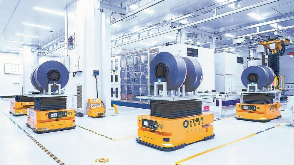 在海辰智慧工厂,只见上下料机械臂、AGV机器人等自动化设备相互配合,辗转腾挪之间,完成了从电池材料到电芯的制造全过程,实现全流程数字化实时监测。