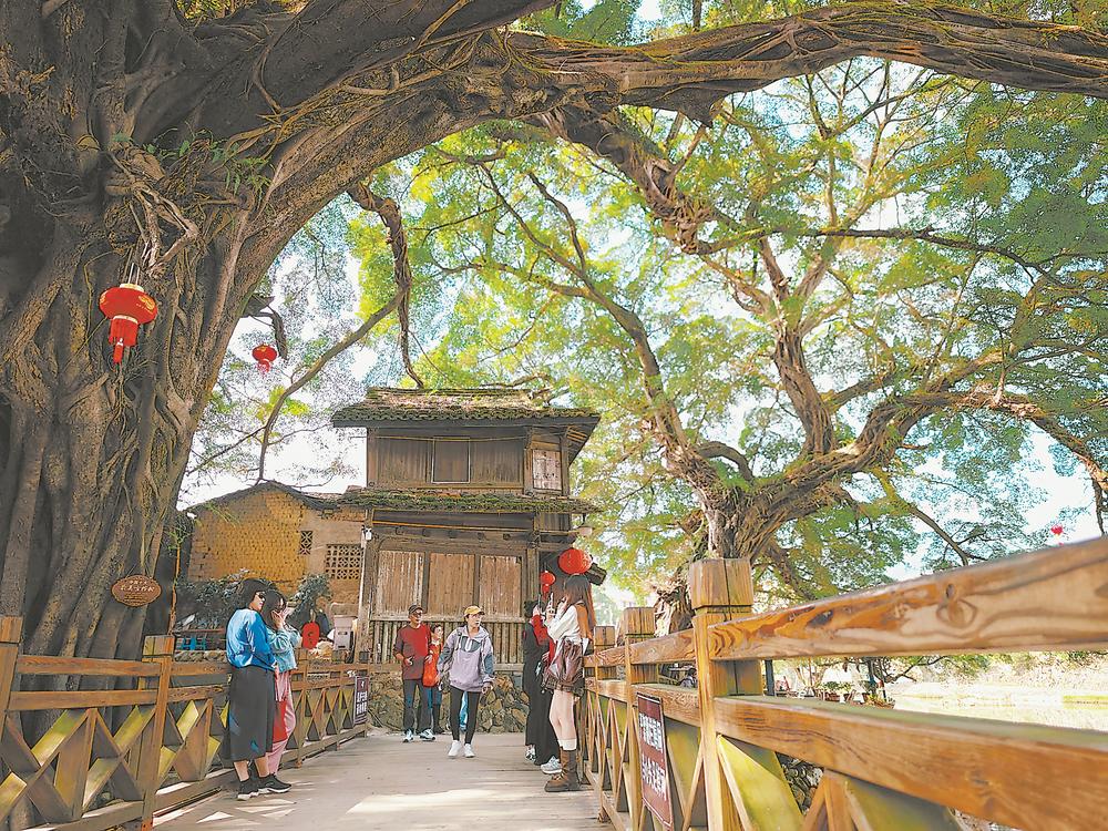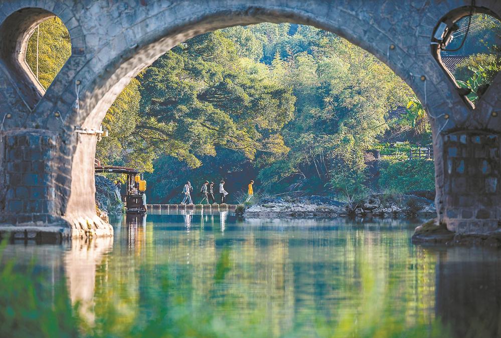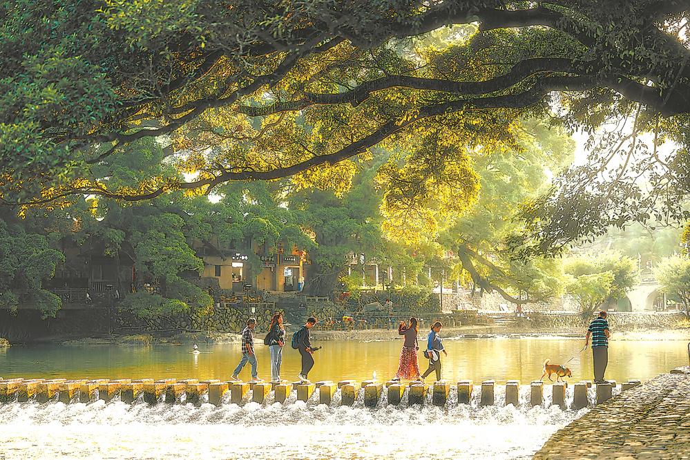船场溪蜿蜒流过官洋村,溪旁老榕状如华盖,游客通过“石跳”走到对岸去。