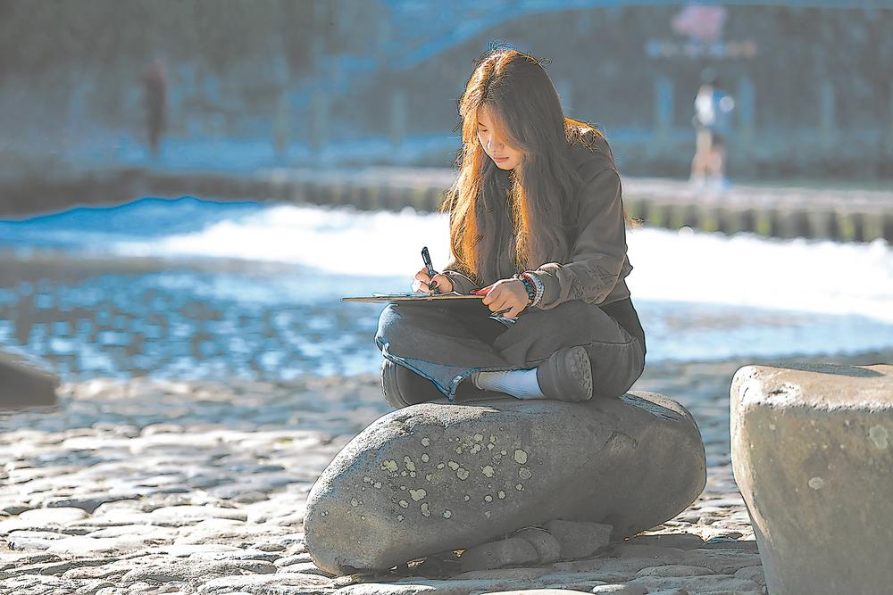 女生聚精会神地描绘云水谣景区的诗情画意。