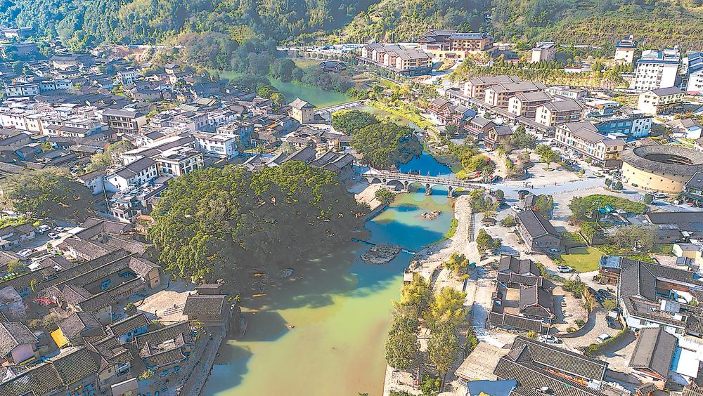 潺潺流淌的溪水、高大茂盛的巨型古榕群、阳光铺洒的鹅卵石古道、形态各异的土楼、鳞次栉比的村舍……初冬时节,走进官洋村,一幅山川与田园、土楼交织的美丽乡村画卷徐徐展开。