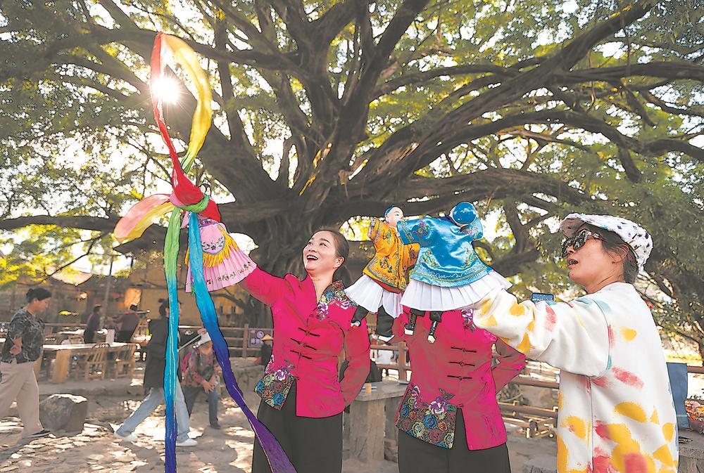 非遗传承人杨荣兰(左)指导游客体验漳州掌上木偶。