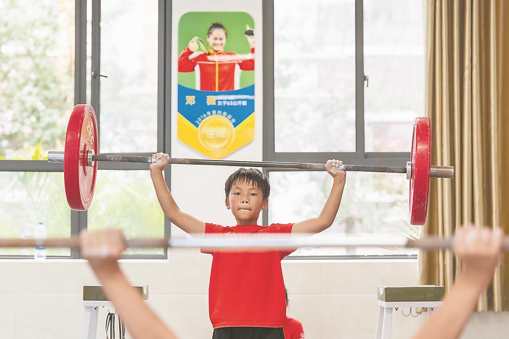 学生在福州市晋安区第三实验小学开展举重训练。林熙 摄