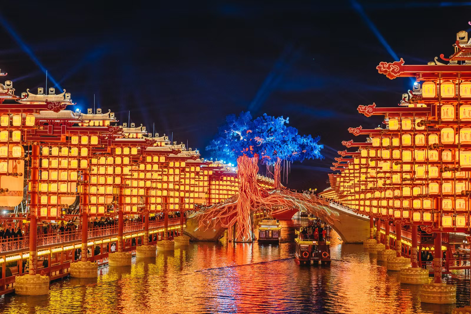 站在河头老街桥上,看“煤河”两侧近百盏巨大的唐风灯笼绵延,身着唐装汉服的游客缓步走过。俯身看“煤河”水波荡漾,映射两侧的彩灯五光十色,宛如置身繁盛的唐朝街巷。