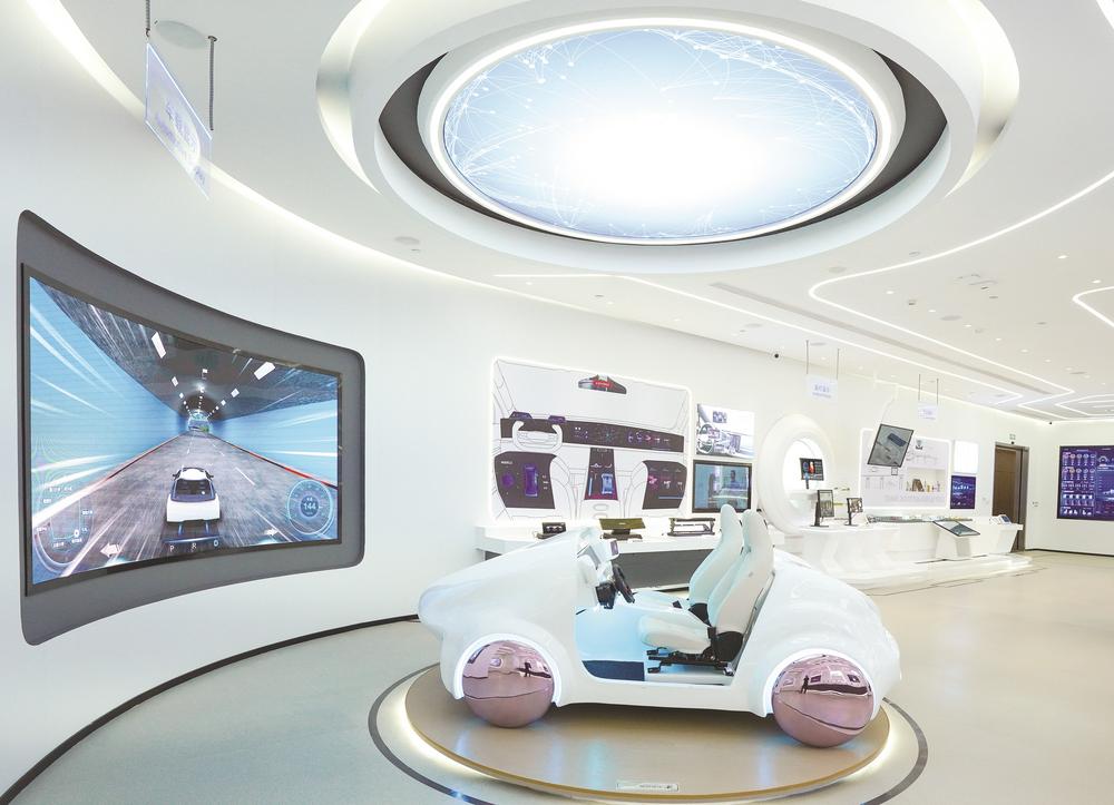 在厦门天马微电子股份有限公司展厅,车辆模型展示其自主生产的车载中控屏。