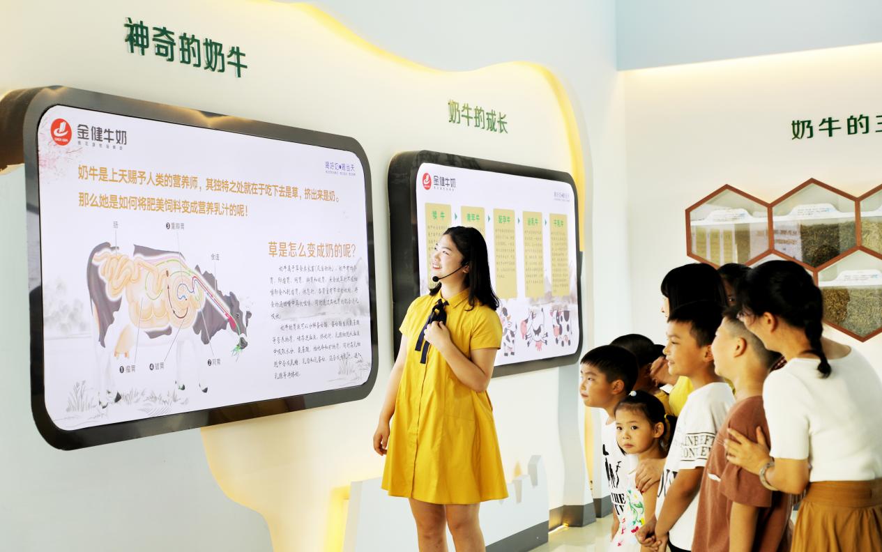 牧场内,农耕文化展示区、环保科普区、亲子休闲广场、小牛互动区等科普与娱乐设施一应俱全。在奶牛文化长廊,前来参观的游客可以亲眼了解“草变为奶”的过程。