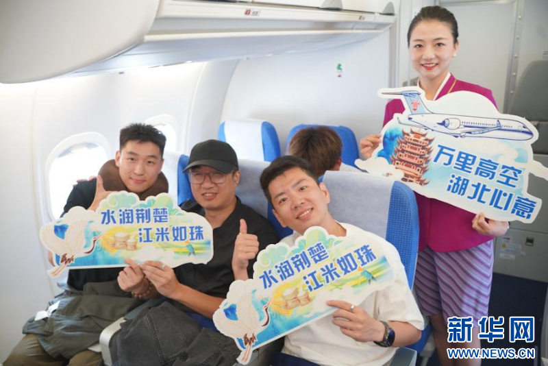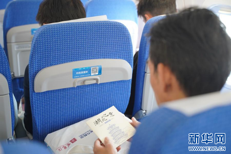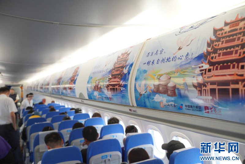 航班登机门、行李架等醒目位置装饰着以江汉大米、国产飞机、黄鹤楼为核心元素的主题视觉画面,展现湖北风情。