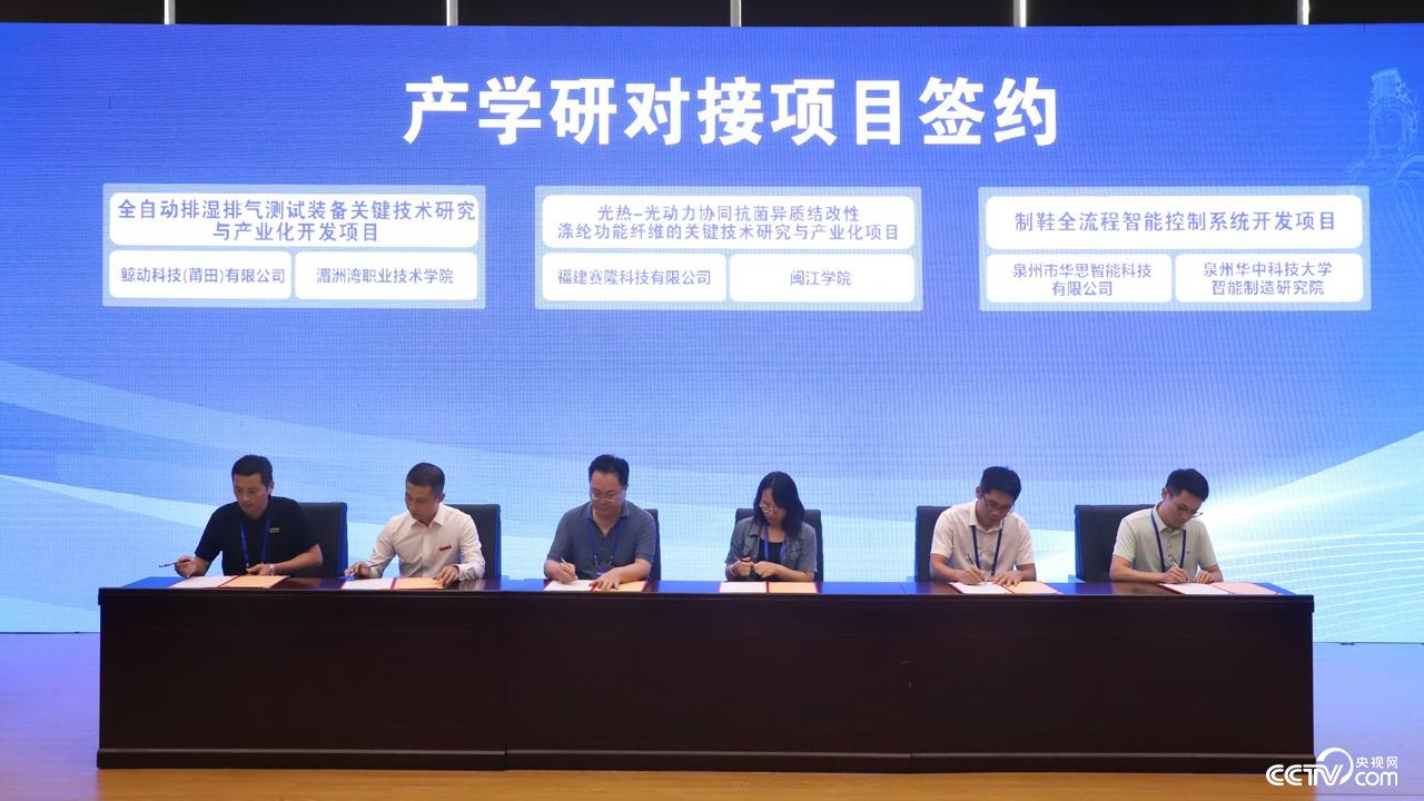活动现场,福建双驰科技有限公司、福建华峰新材料有限公司、信泰(福建)科技有限公司等9家企业分别与湄洲湾职业技术学院、莆田市新型功能材料产业技术研究院、东华大学等高校、科研院所进行签约,将为推动福建省鞋产业科技进步和技术创新,促进产业结构优化和转型升级作出新的更大贡献。