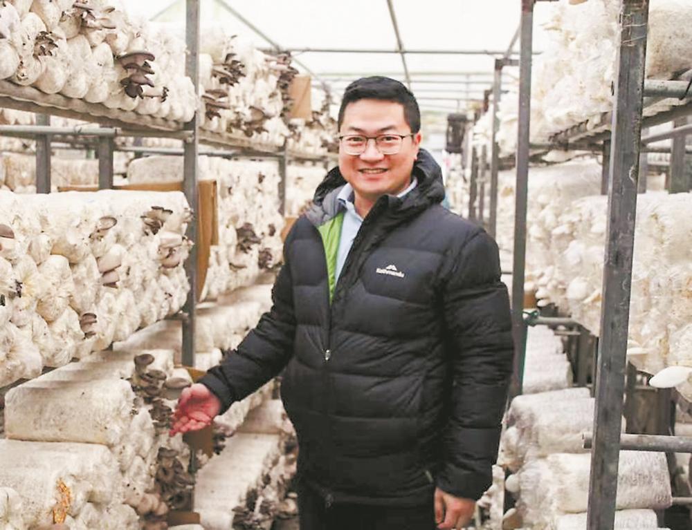 吴耀民在农场里查看蘑菇长势。(受访者供图)