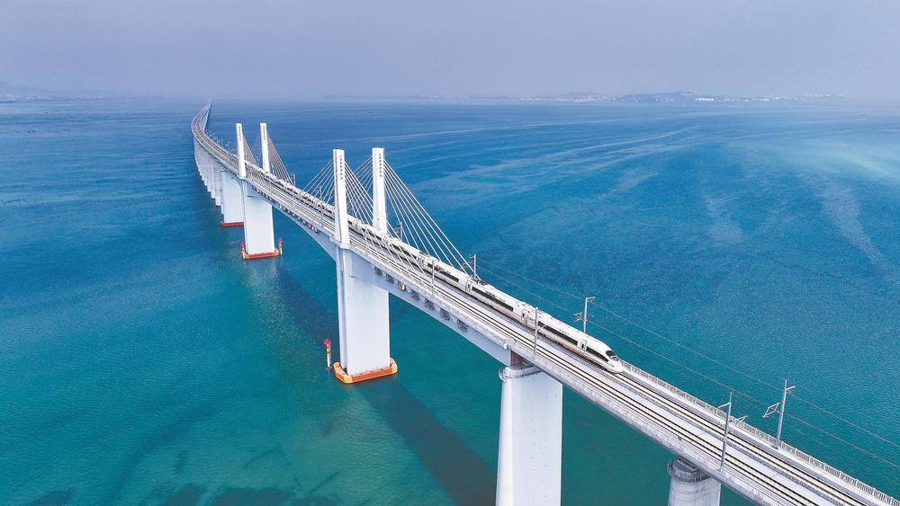 列车经过福厦高铁线上的湄洲湾跨海大桥。邹碧峰 摄