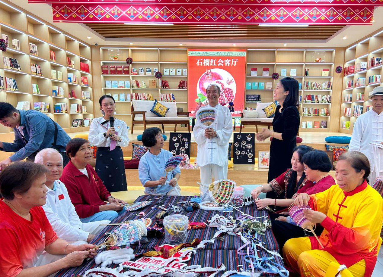 沛鸿社区的“石榴红会客厅”里,居民们在制作团扇(黄月芬/摄)