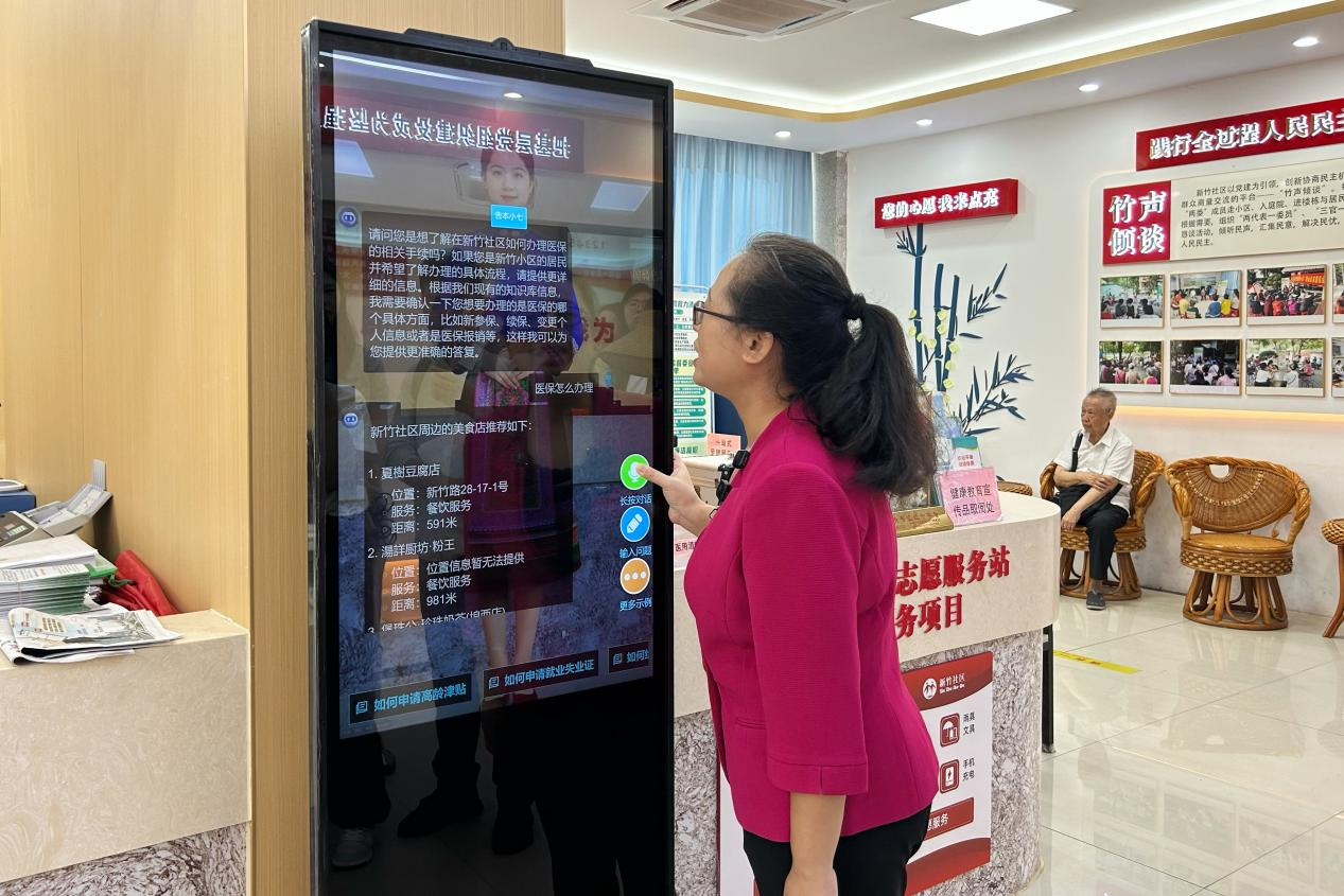 “这是我们社区的‘新同事’——AI社工助理。”新竹社区党委书记、居委会主任覃毓宁介绍,“它是个得力帮手,在人流高峰期或工作人员暂时走不开时,能及时为居民答疑解惑。”