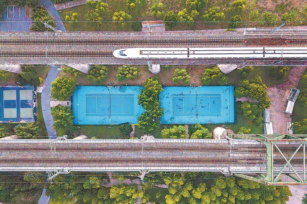 8月16日,福州榕华网球公园,因其位于高铁高架桥下的独特地理位置,吸引了不少网球爱好者前来运动打卡。 陈天博 摄
