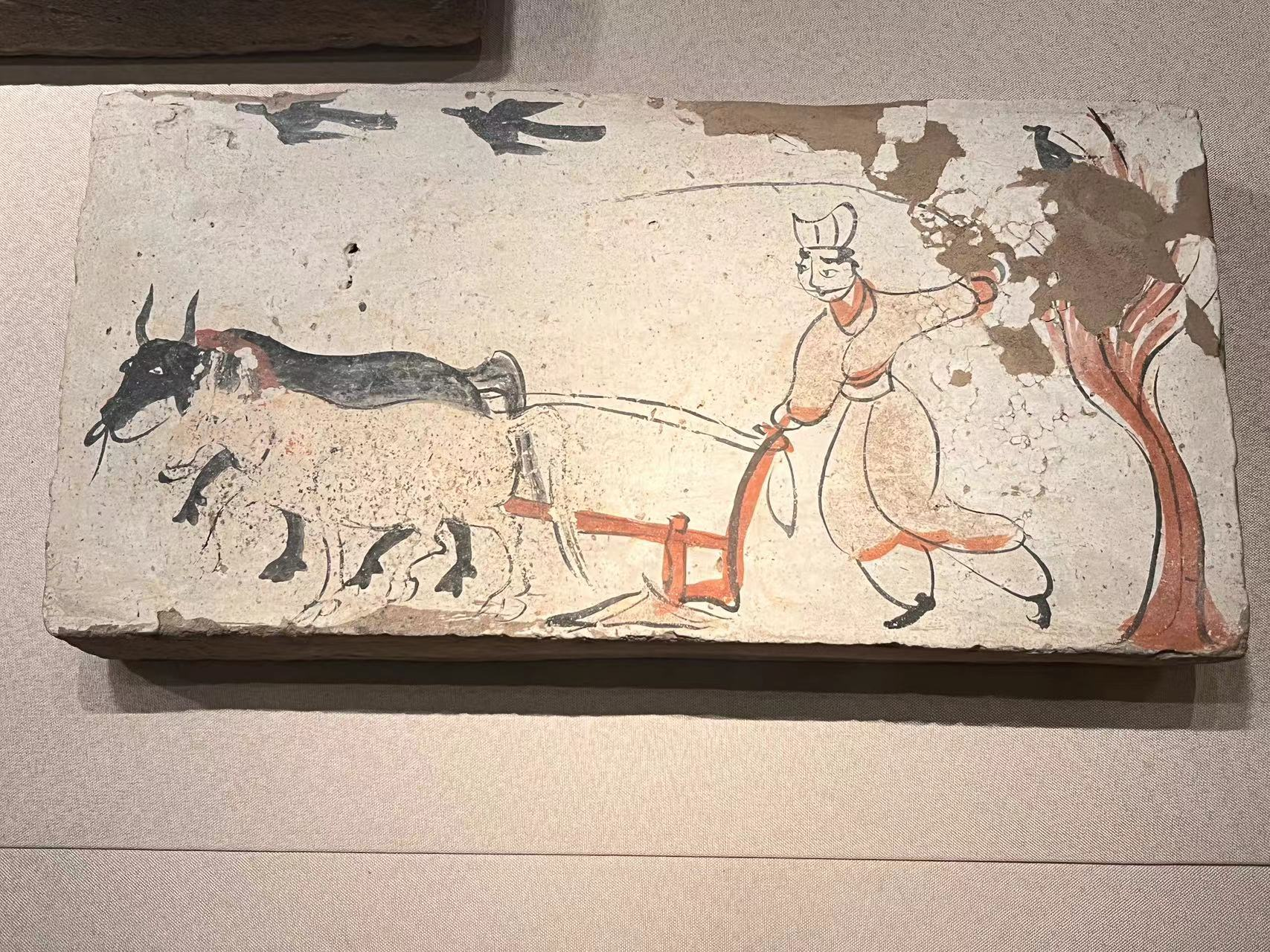 《二牛犁耕图》展现了当时的耕作技术,农夫扬鞭,双牛奋力,泥土翻飞,是绿洲屯垦的生动写照。