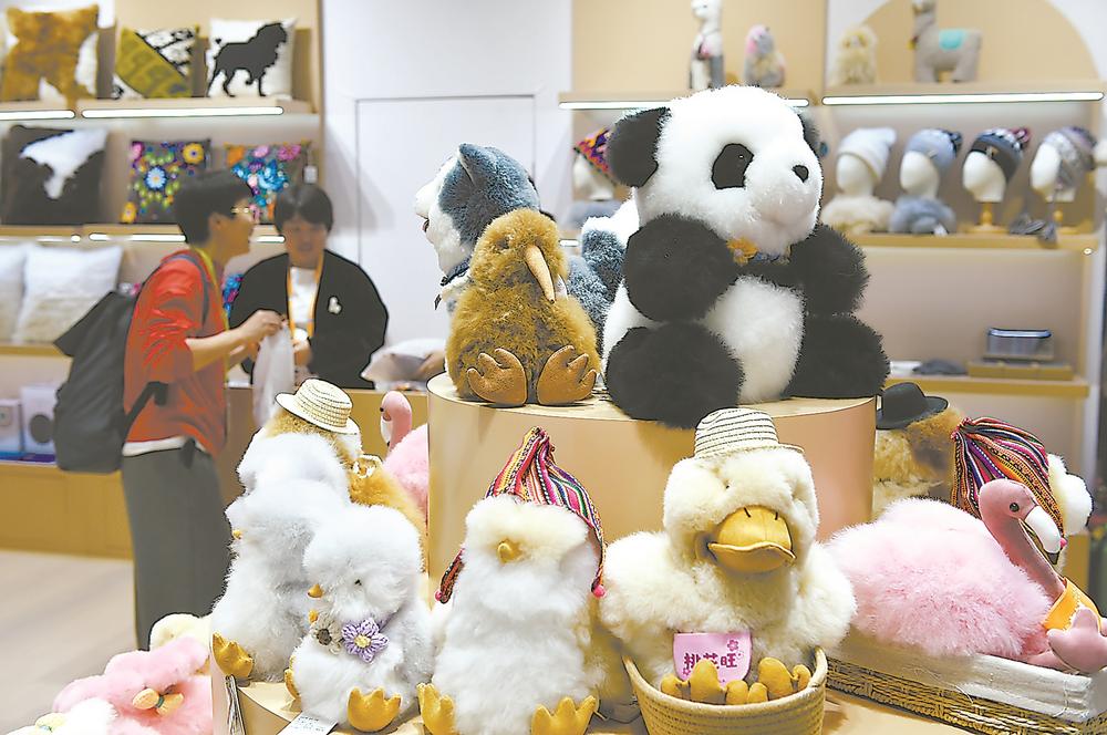 11月5日,观众在第八届进博会消费品展区选购毛绒玩具。 新华社发