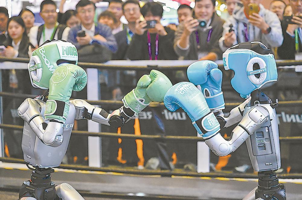 11月6日,在第八届进博会宇树科技展台,人形机器人进行格斗表演。 新华社发