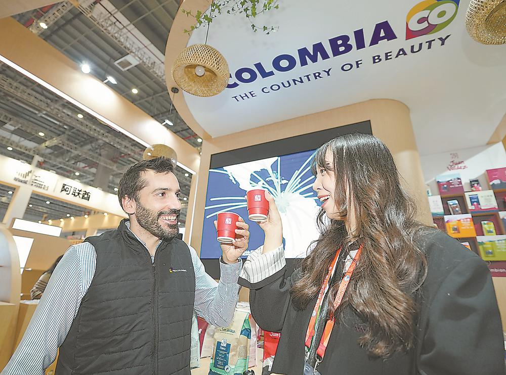 11月5日,在第八届进博会国家展哥伦比亚馆,参展商(左)和媒体记者一起品尝咖啡。 新华社发