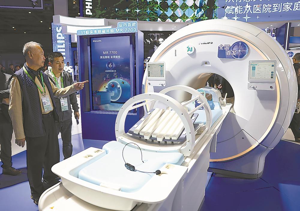 11月6日,参观者在进博会医疗器械及医药保健展区飞利浦展台了解MR7700多核磁共振设备。这是该产品在中国首发。 新华社发