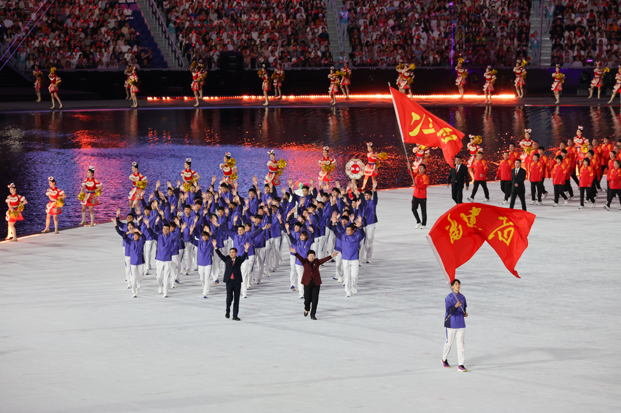 央视网消息 11月9日晚,第十五届全国运动会开幕式在广东奥林匹克体育中心举行,开幕式上,福建省体育代表团伴随《爱拼才会赢》的音乐入场。担任本次旗手的是跆拳道运动员项启彰,他也是本届全运会福建首金的获得者。