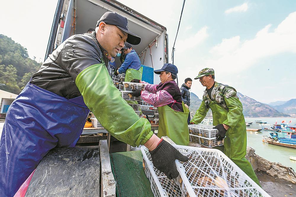 在罗源碧里乡牛澳码头,刚上岸的鲍鱼被传送带送上冷链车。