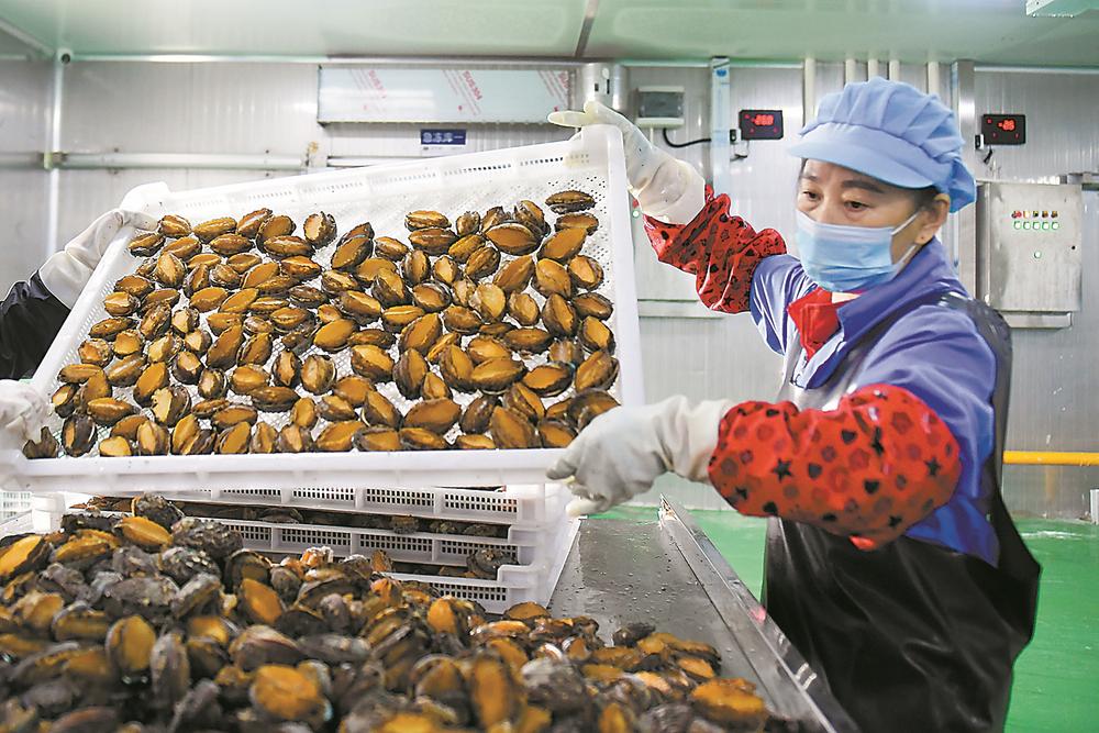 在供应链中心,工人对鲍鱼进行冷链加工。