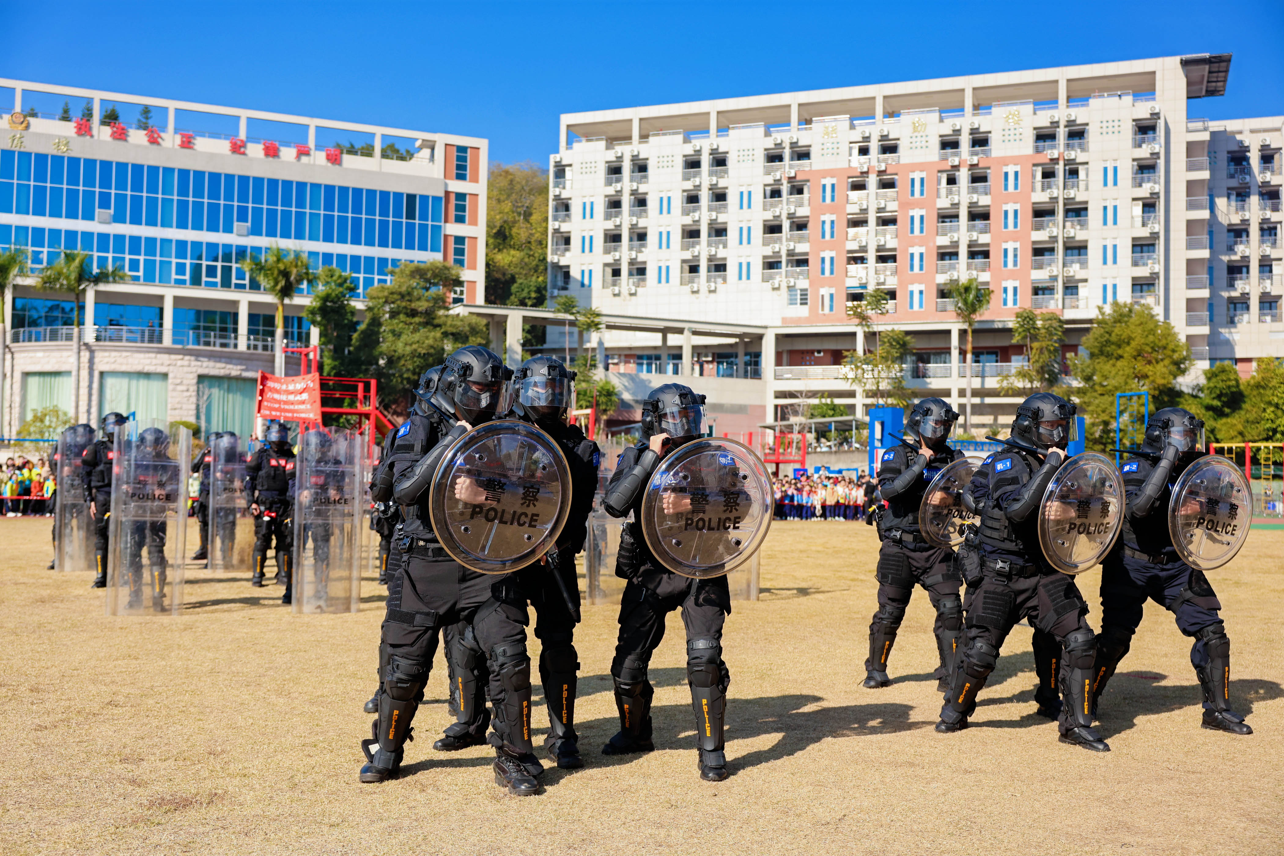 上午9时许,急促的警报声划破营区上空,楼宇突击科目率先拉开帷幕。特警队员凭借精湛战术素养,迅速完成房屋突入、楼宇索降等一系列高难度动作;无人机编队精准完成非致命性警械投放、穿越机打击气球等科目演示,展现科技赋能警务的强大效;应急处置队伍的队形转换、推进驱散等演示整齐划一,充分彰显快速集结、高效处置的过硬本领;格斗术表演环节,队员们招式凌厉、配合默契,精彩的近身制敌技能赢得现场观众阵阵掌声与欢呼。