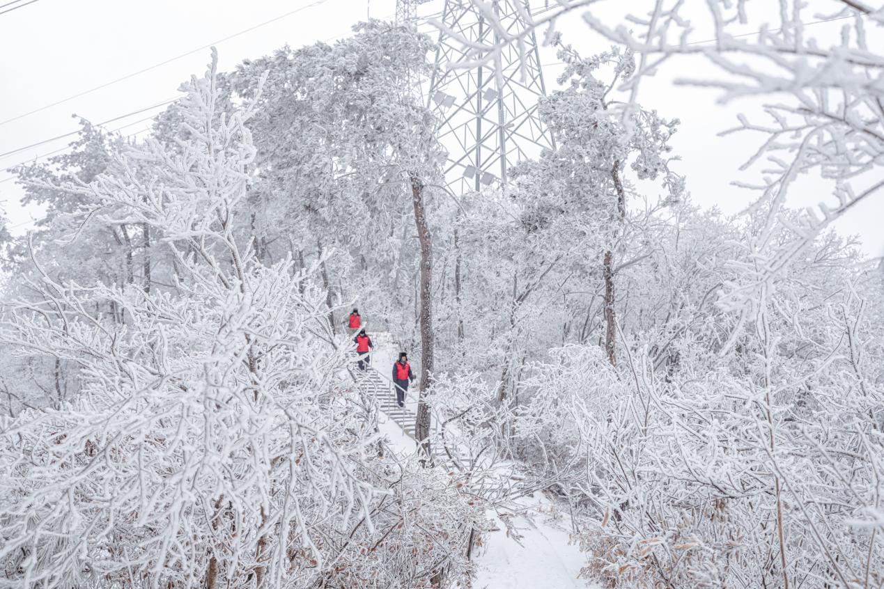 1月20日上午,国网武汉供电公司输电运检分公司运检六班的成员们脚穿“冰爪”鞋,一步步爬上海拔800米山顶,来到位于武汉之巅黄陂清凉寨山上的220千伏闵冯一二回75#—76#区段。