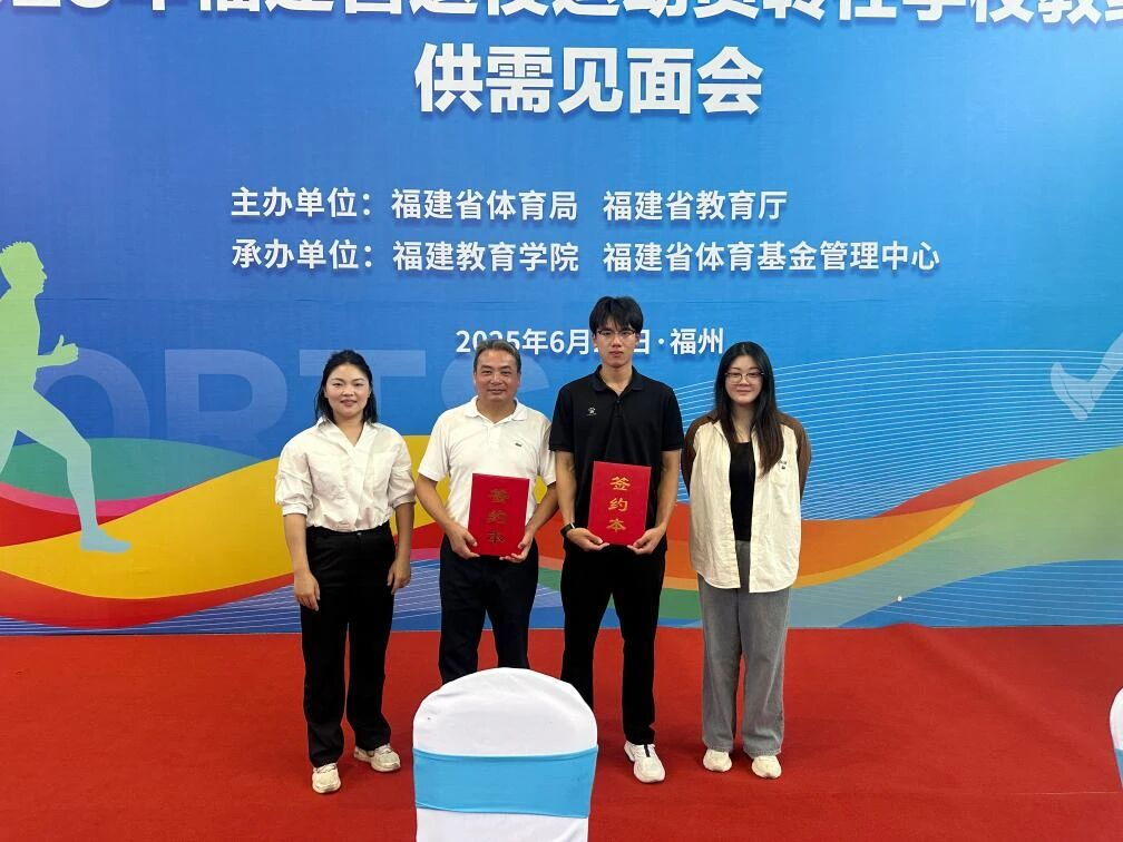 2025年福建省退役运动员转任学校教练员供需见面会举办,退役运动员叶乃强(右二)与平潭流水镇中心小学校长陈国武(左二)签约意向书。