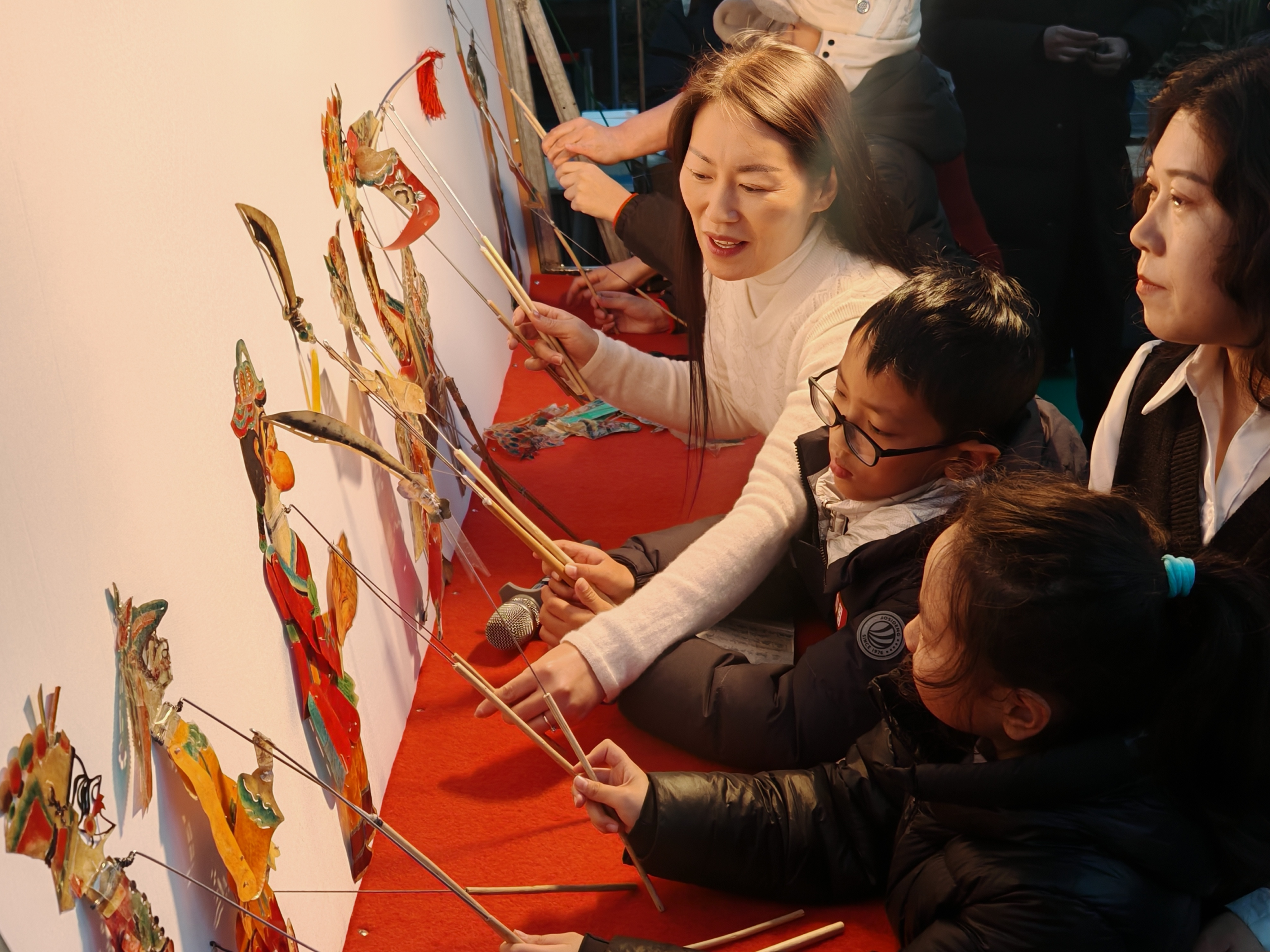 望奎皮影的艺人们带来了精彩的皮影戏表演。一段段生动有趣的故事情节缓缓展开,孩子们眼睛紧盯着幕布,生怕错过任何一个精彩瞬间,一张张好奇的小脸上,写满了对这项古老非遗的喜爱与向往,偶尔还会跟着唱腔轻轻哼唱,现场氛围十分热闹。皮影戏表演结束后,非遗体验热度不减。