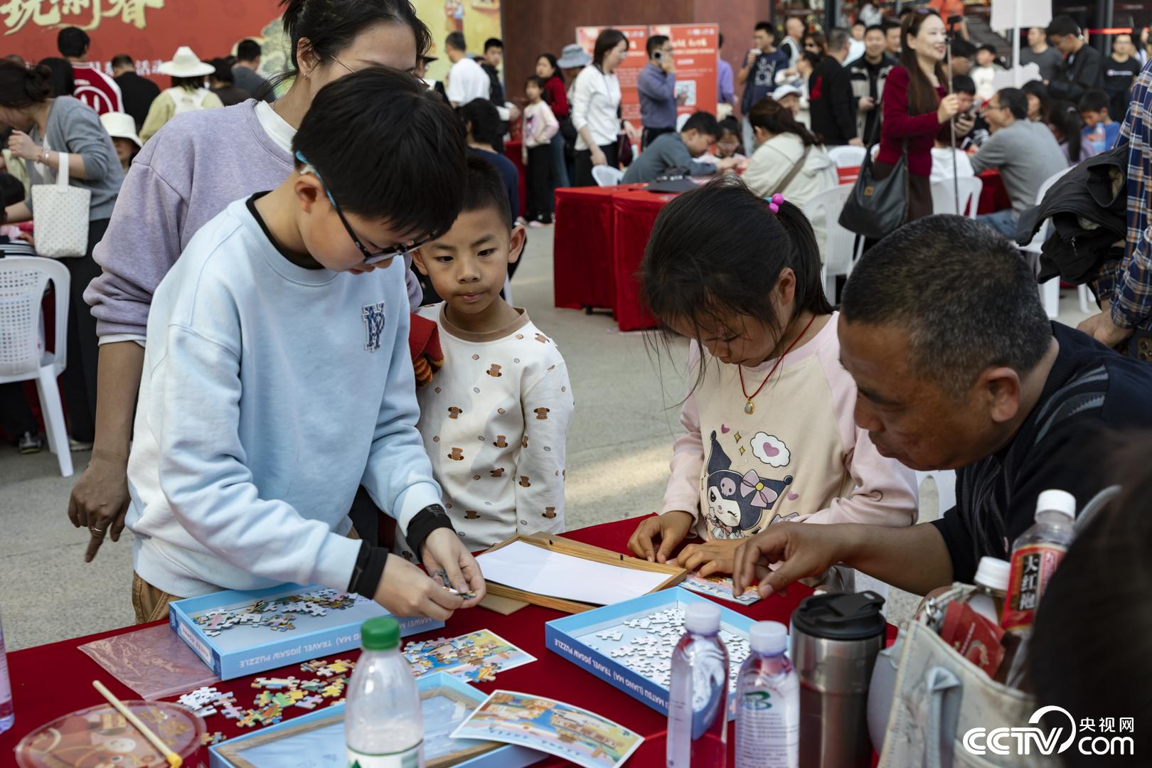 家长与孩子一起参与文创拼图、花灯制作等亲子互动项目。宋宁宇 摄