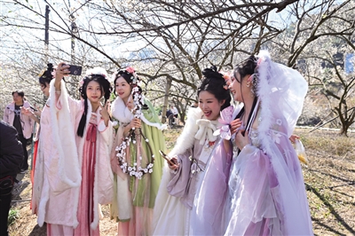 一群穿着古装的女孩在福建省永泰县葛岭镇文埕湾的梅园游玩、拍照(记者 姜克红 摄)
