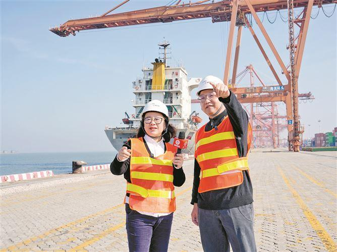 记者吴晓菁在海天码头采访吴建良(图右)。(记者 卢剑豪 摄)