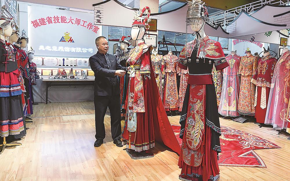 他说:“这是我们在第十六届海峡两岸文博会时展出的创新型畲族‘凤凰装’,以鲜明的色彩、独特的剪裁吸引观众目光,当时很多人前来试装体验。”