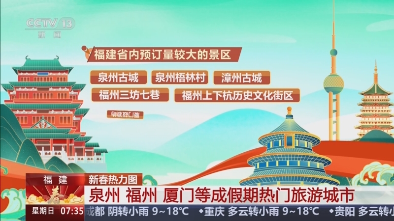 新春热力图·福建:泉州、福州、厦门等成假期热门旅游城市。